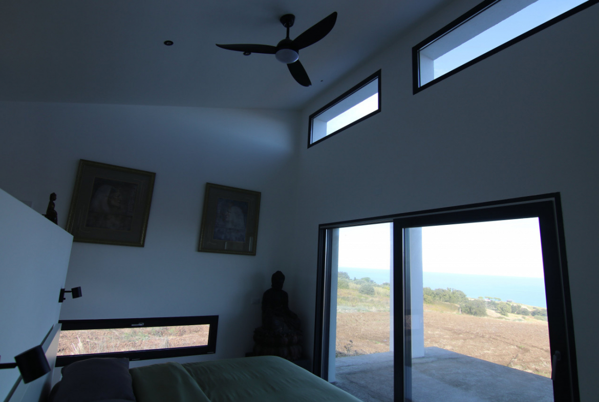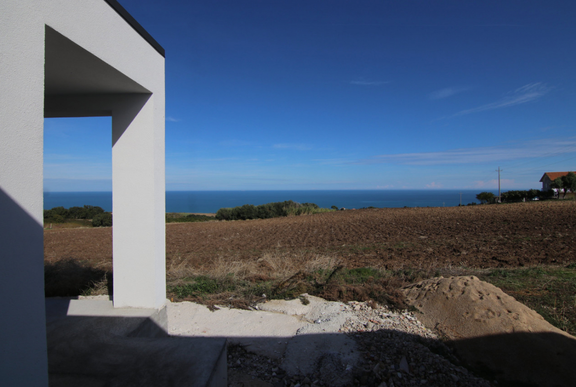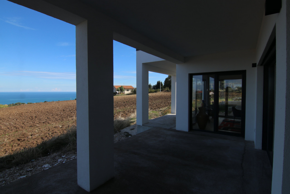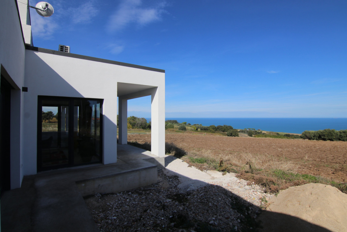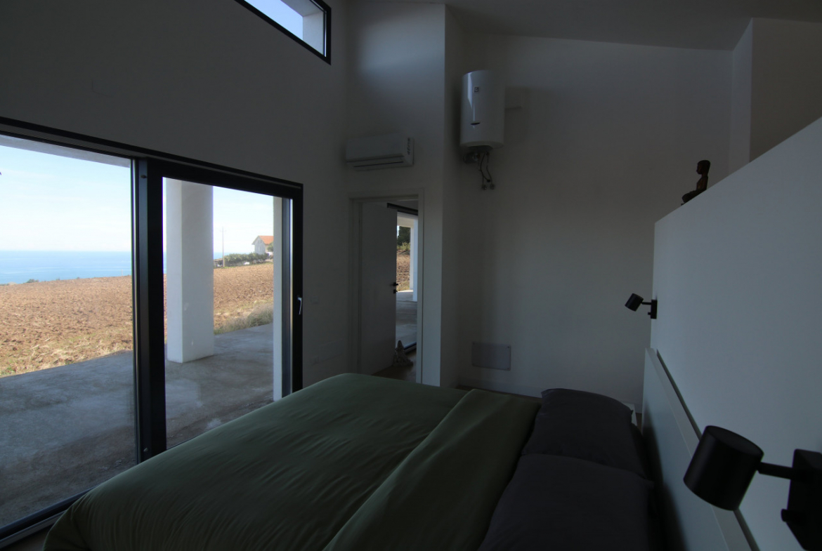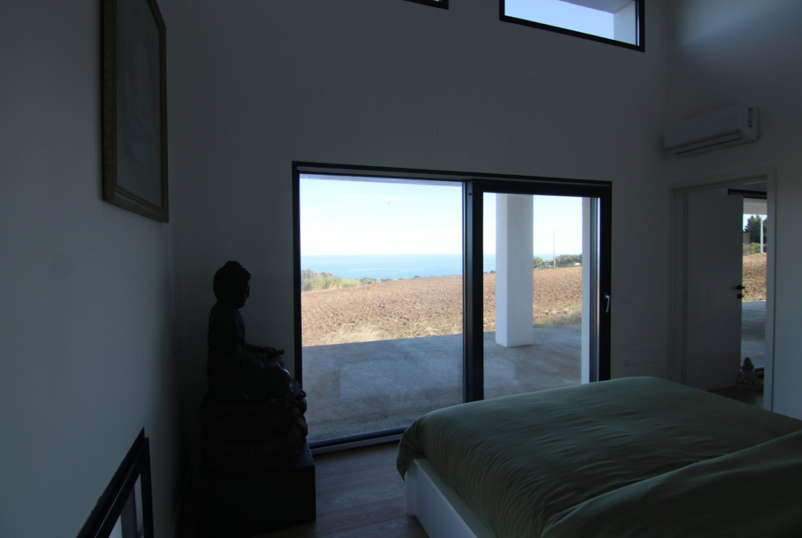The villa appears almost without warning, when the road lifts gently between the hills of Petacciato. The sea stretches in the distance like the backdrop of an oil painting, against which the house rises as a white, essential monolith set into a landscape that still retains a trace of wilderness. The large square window sees nothing but the endless sea.