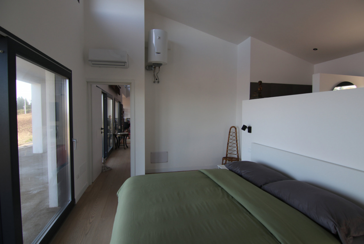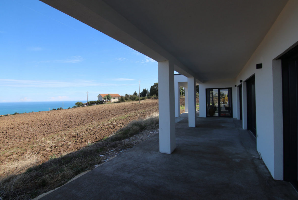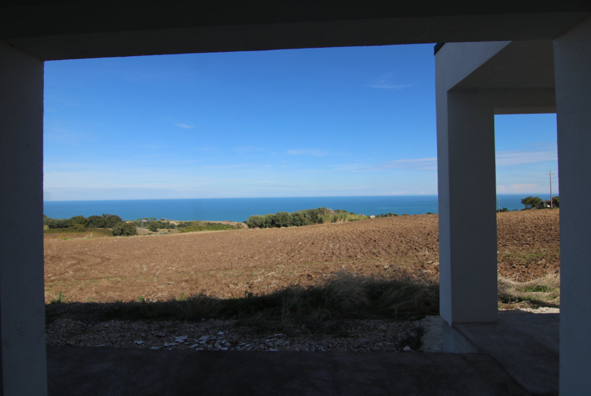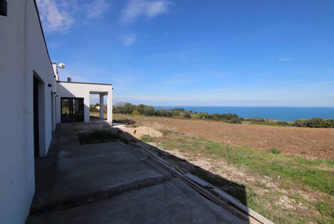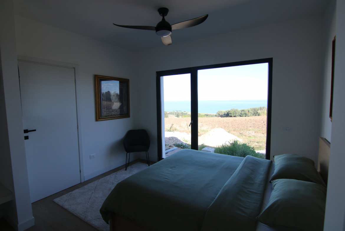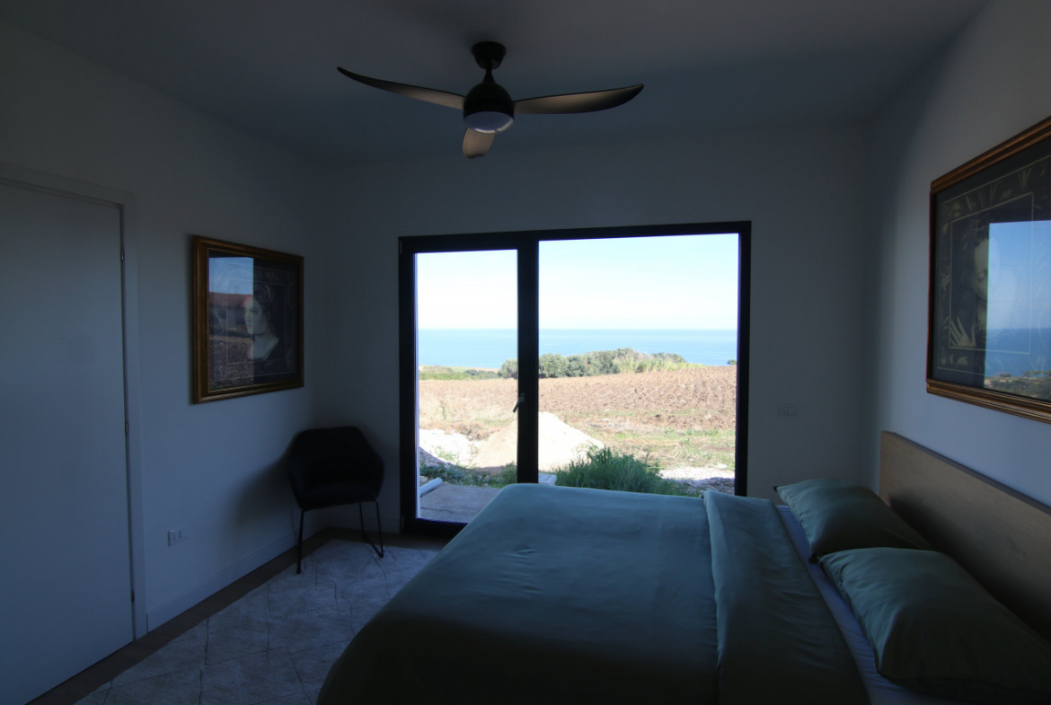 The villa appears almost without warning, when the road lifts gently between the hills of Petacciato. The sea stretches in the distance like the backdrop of an oil painting, against which the house rises as a white, essential monolith set into a landscape that still retains a trace of wilderness. The large square window sees nothing but the endless sea.