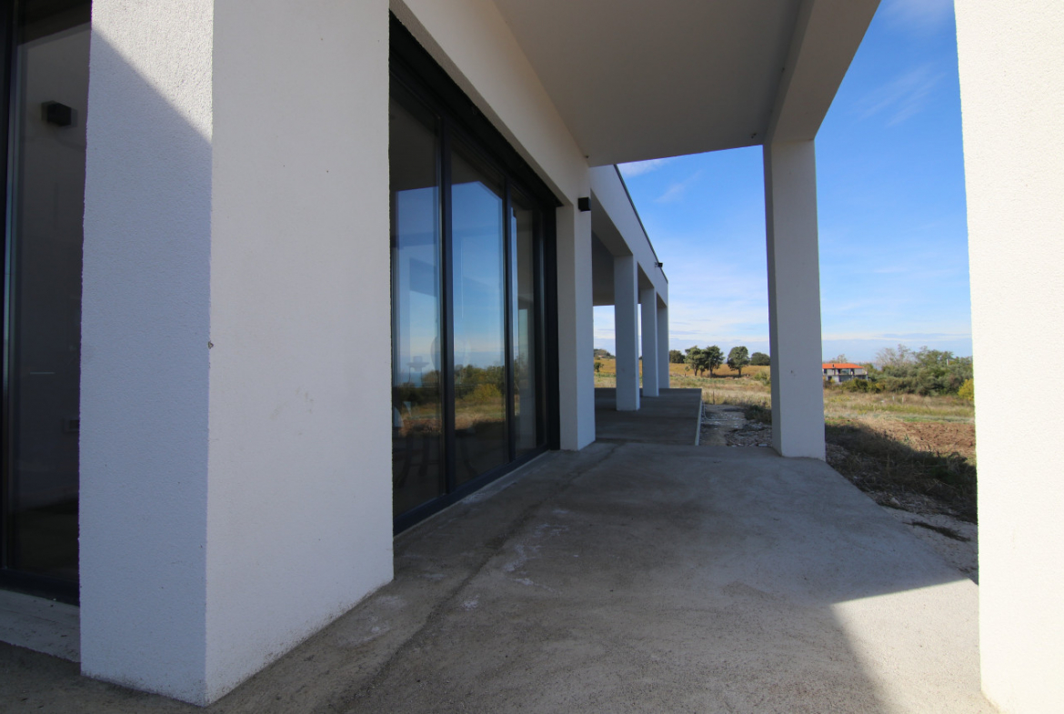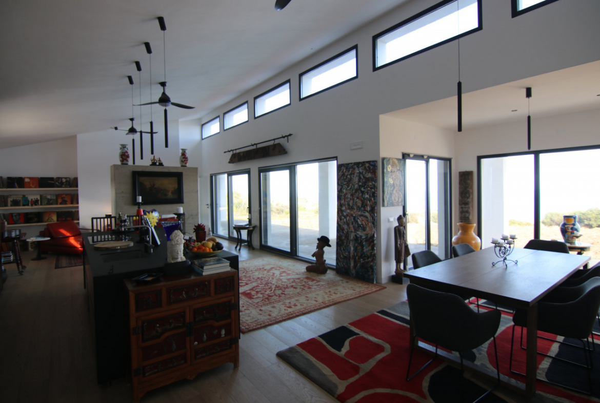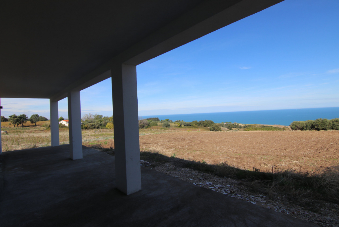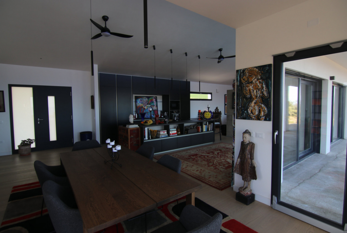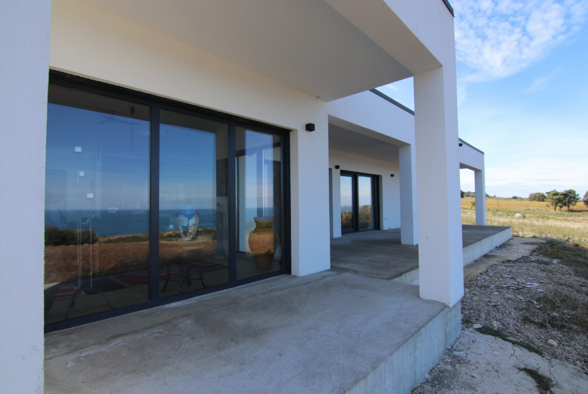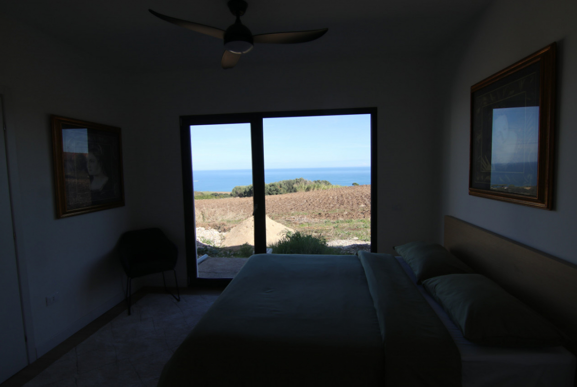 The villa appears almost without warning, when the road lifts gently between the hills of Petacciato. The sea stretches in the distance like the backdrop of an oil painting, against which the house rises as a white, essential monolith set into a landscape that still retains a trace of wilderness. The large square window sees nothing but the endless sea.
