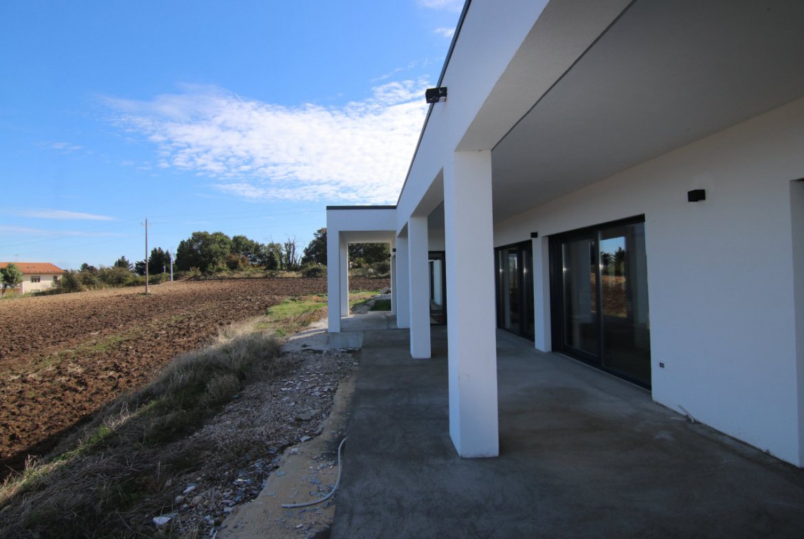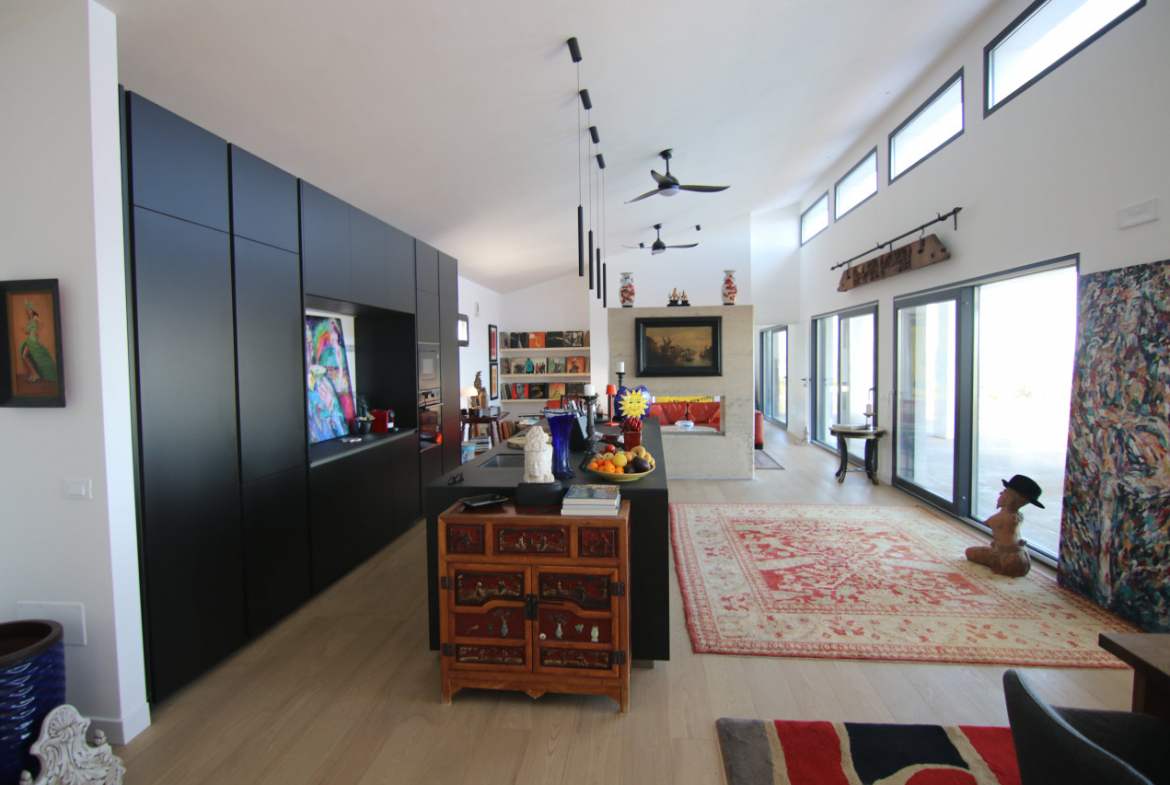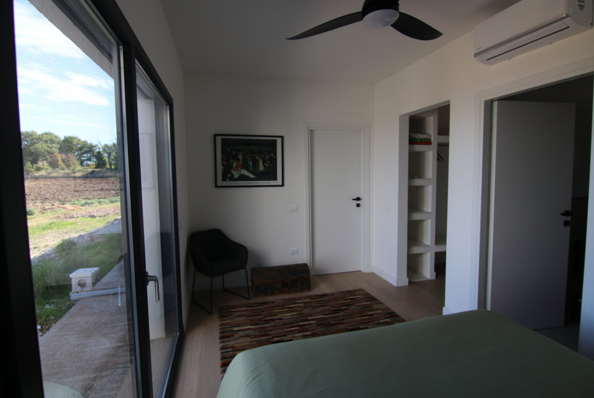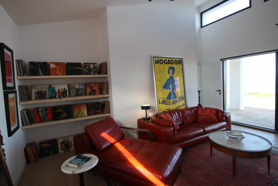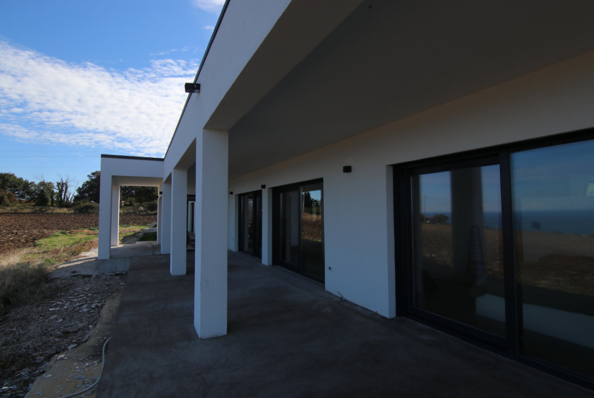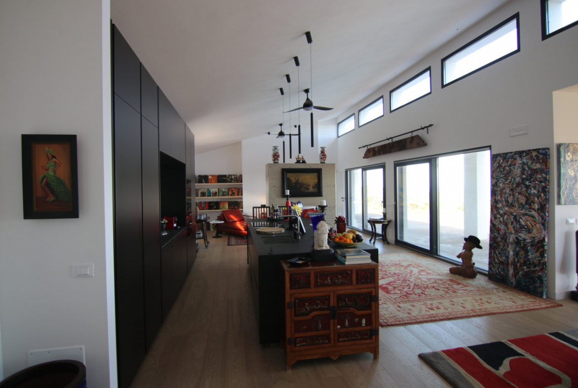 The villa appears almost without warning, when the road lifts gently between the hills of Petacciato. The sea stretches in the distance like the backdrop of an oil painting, against which the house rises as a white, essential monolith set into a landscape that still retains a trace of wilderness. The large square window sees nothing but the endless sea.