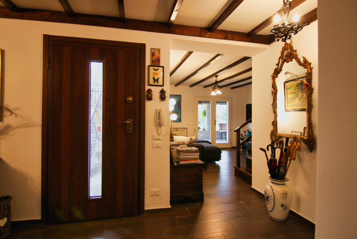 Porte interne villetta In legno tamburate laccate bianche a piano terra, in legno di noce massello con doppia specchiatura tinta noce medio al 1° piano