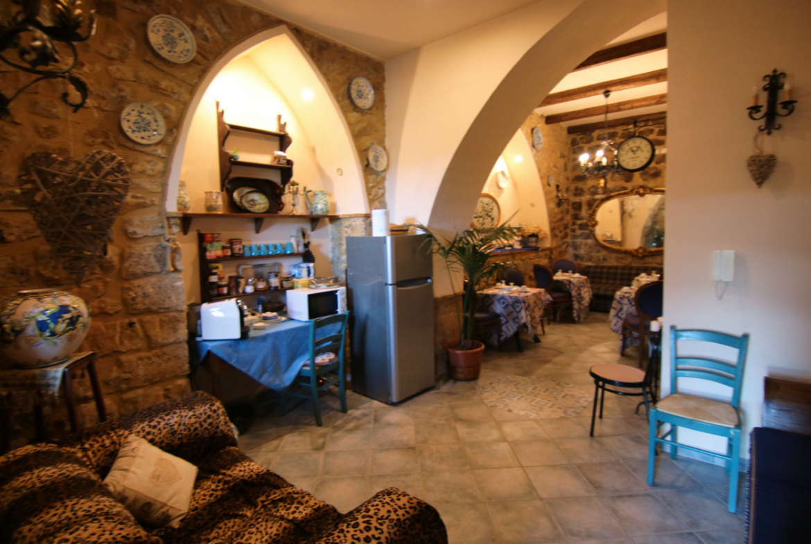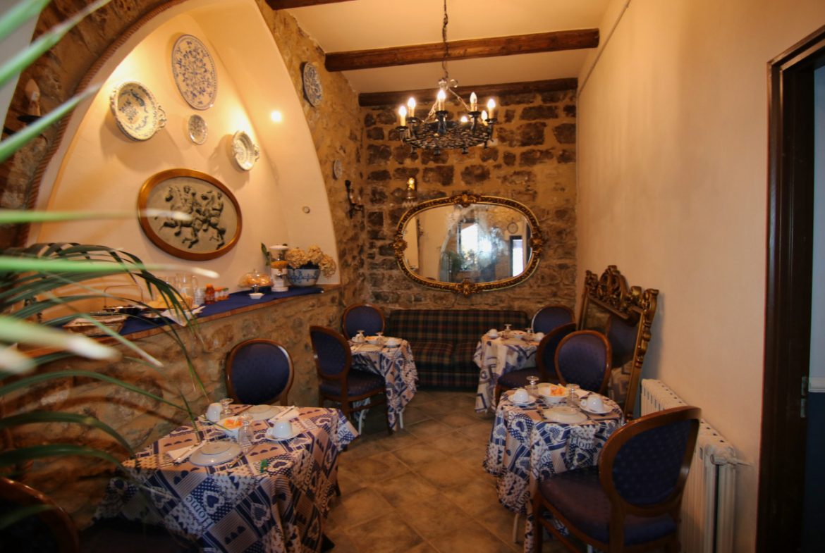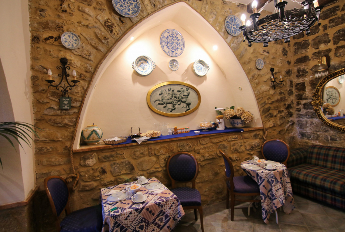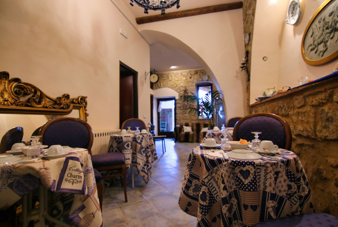 Entrando dall’ingresso sulla via principale, Lorenzo accompagna gli ospiti lungo la scala. «La casa segue il terreno», spiega, «così salendo si entra nell’antico appartamento, mentre scendendo si arriva al giardino». Prima li guida verso il basso. Pochi gradini conducono alla sala colazioni, una grande ambiente dove durante il restauro sono stati riportati alla luce i sassi originali delle mura. La stanza riccamente arredata è decorata con maioliche siciliane e accanto ad essa si trova un bagno dedicato gli ospiti. Aprendo una porta finestra si entra nel giardino u meraviglioso angolo dove una veranda coperta affacciata sulla città ospita i tavoli della colazione. Poco più in là alcuni scalini portano al locale di servizio con la cucina dove Lorenzo prepara ogni mattina caffè, pane caldo e dolci. Scendendo ancora si scopre un secondo giardinetto più raccolto e quasi segreto.